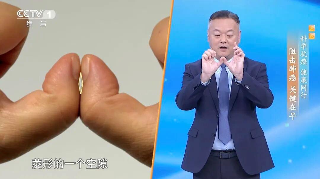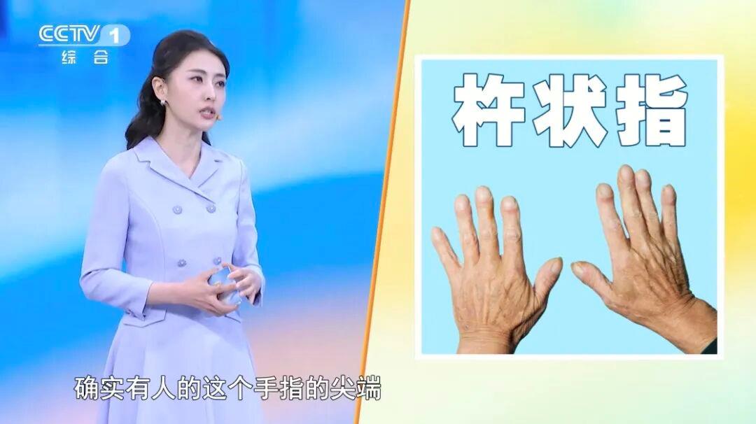 小榔头一样的杵状指。正常情况下,两个手指的指甲盖对合起来后,中间可以形成菱形空隙。