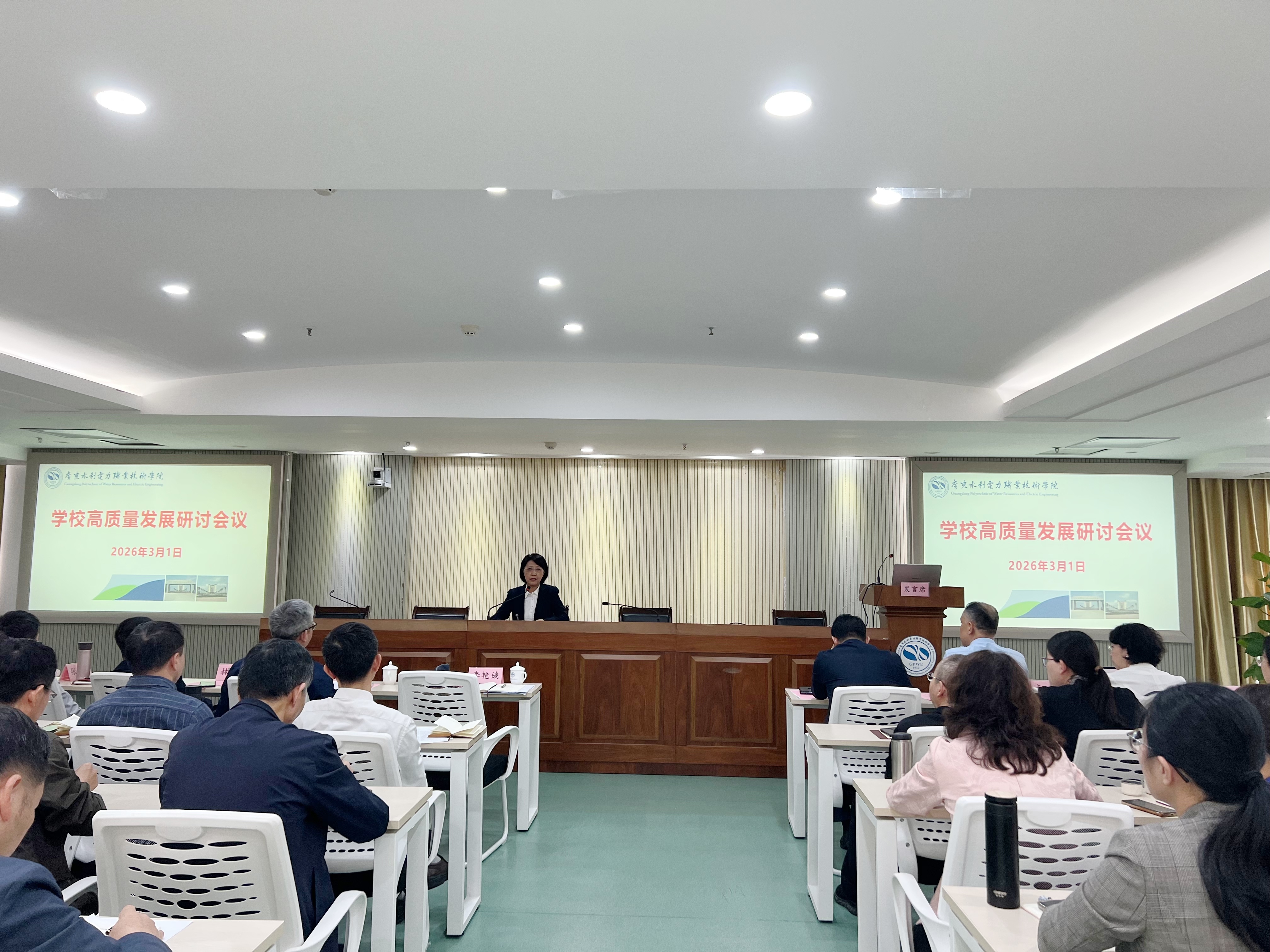 最后,学校党委书记李艳娥作了总结讲话。她指出,本次大会是深入学习贯彻2026年全省高质量发展大会精神的具体行动,也是全面落实学校第五次党代会部署、推进学校高质量发展的关键举措。站在“十五五”开局的新起点上,会议旨在统一思想、谋划未来,以更清晰的思路和更务实的作风,推动学校发展迈上新台阶。面临当前的严峻挑战,各职能部门、二级学院以及全体教职工要锚定学校发展目标,狠抓落实:一是要坚持“三化三心”。日常工作要规范化、标准化和品质化,常怀忧患之心、责任之心和敬畏之心;二是要聚焦“1239”蓝图。坚持立德树人这一根本任务,瞄准“双高计划”建设与申报本科层次职业学校两大目标,聚焦水利电力行业转型升级、粤港澳大湾区经济社会发展核心需求、广东现代化产业体系建设三个方面,整体推进九大重点任务;三是要强化目标管理。实现新的发展目标需要不断进行机制创新、制度创新、管理创新、专业创新。要求目标管理有体系、有指标、有标准、可测量、有时限、有考核、有应用。李艳娥强调,要以“改革创新、激发动能、系统发力”为着力点,激发全校教职员工的潜能,发挥职能部门中坚作用,以打攻坚战的决心推进工作。